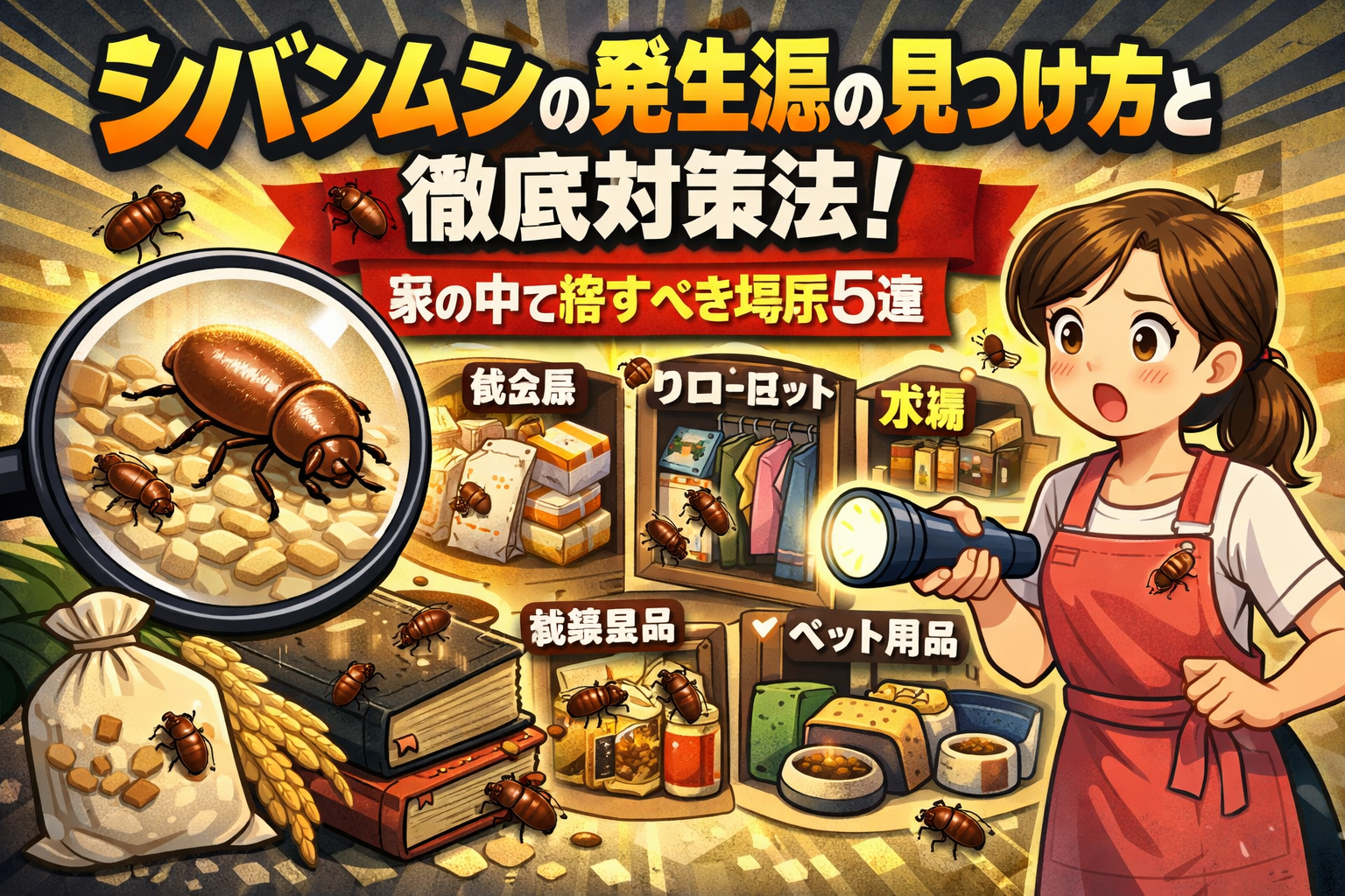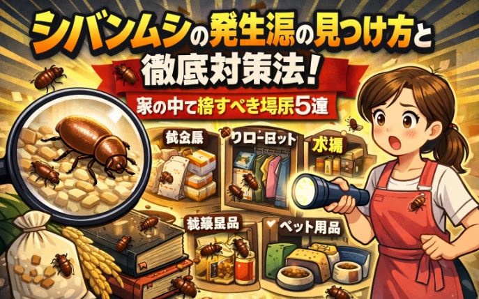 この記事では、家の中に出るシバンムシの原因や発生場所の見つけ方、すぐにできる予防・駆除方法を解説しています。